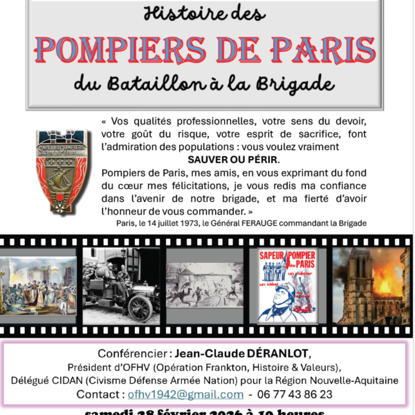 L’annonce de la conférence « Histoire des Pompiers de Paris, du Bataillon à la Brigade » et l’ordre du jour 3-73 de la Brigade sont en pièces jointes.